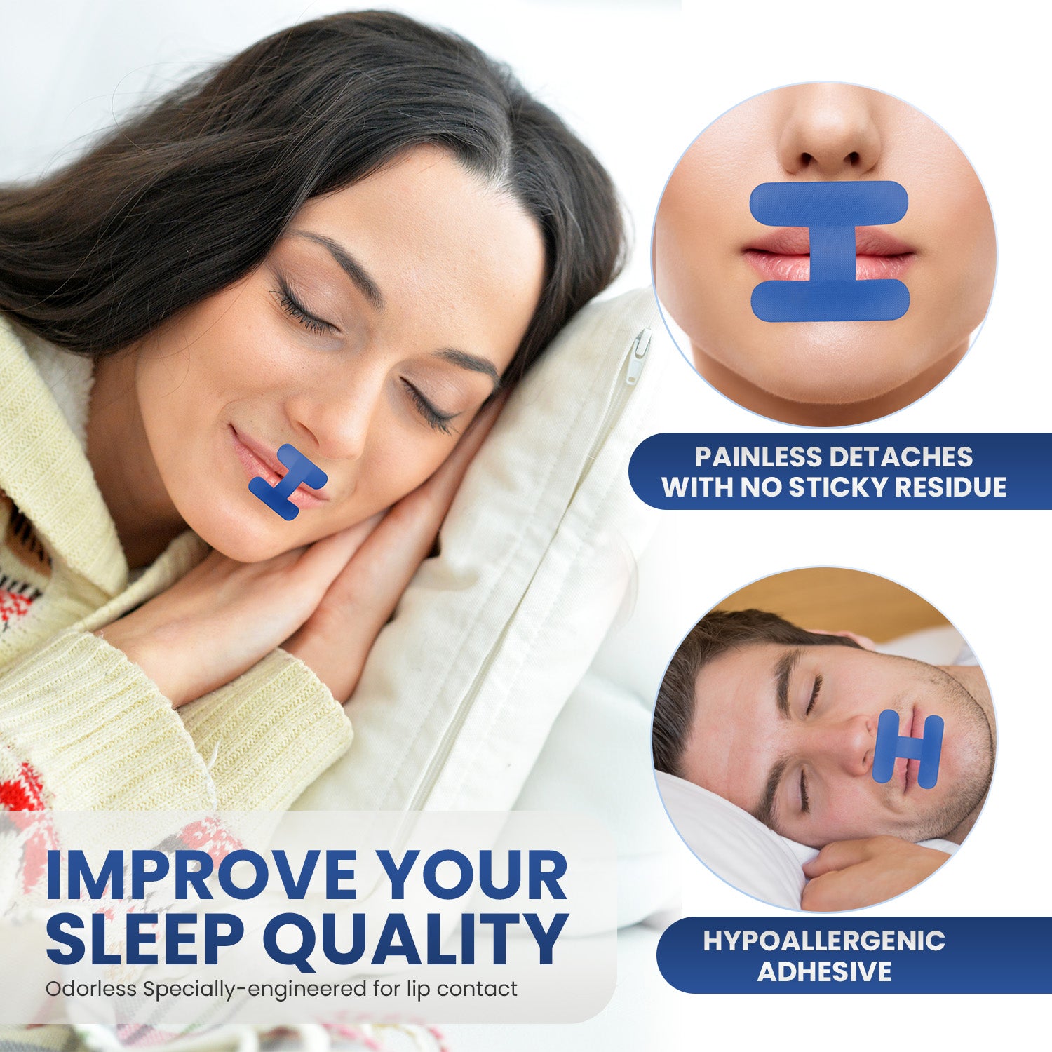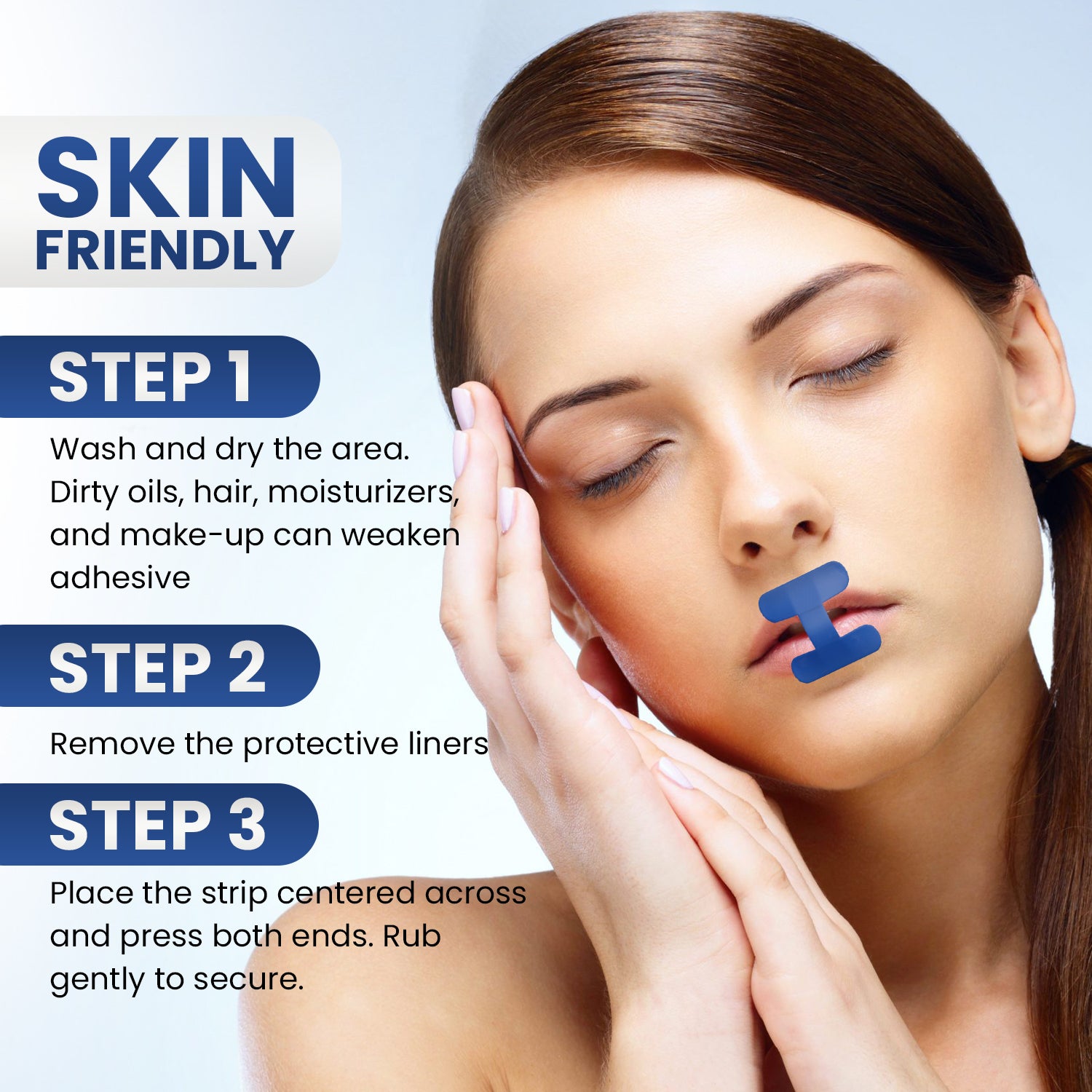 Your bedtime buddy for better sleep and feeling awesome! Get a 3-month pack with 90 comfy strips. It's gentle on your skin, easy to use, and won't bother you even if you drool a bit. Say goodbye to snoring and hello to a healthier you! Get more oxygen, better blood flow, and immune support. Plus, it's friendly to your face. Sleep better, feel better – try our Sleep Tape now!