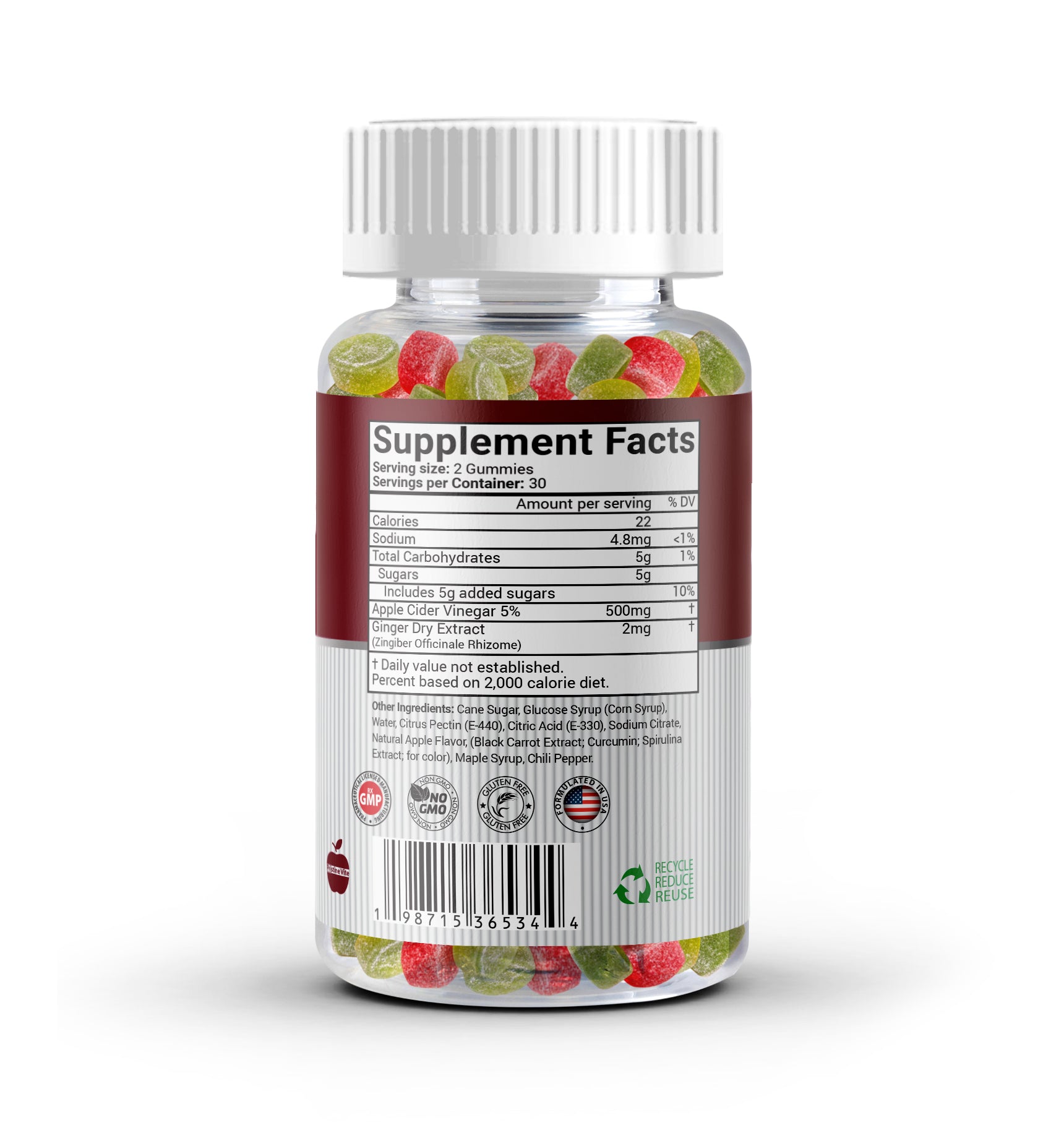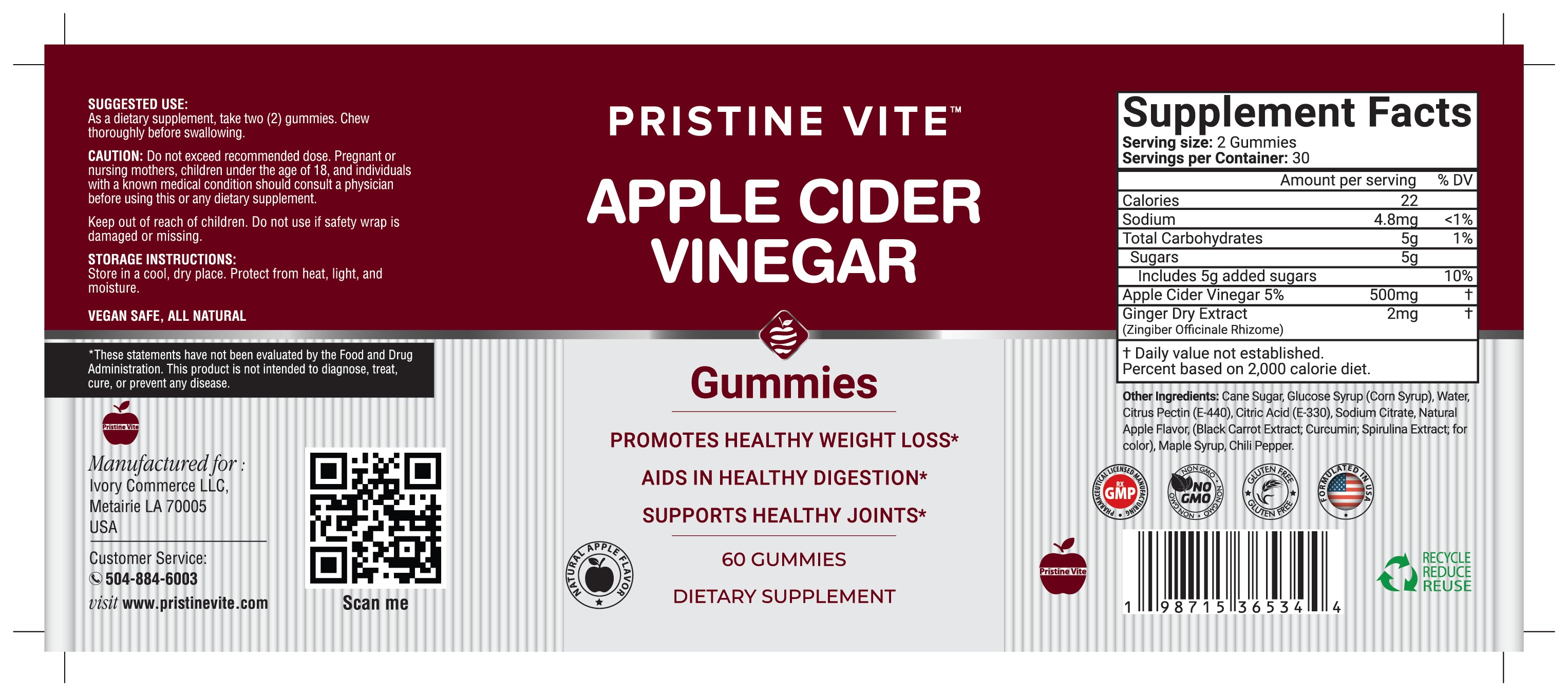 Pristine Vite Apple Cider Vinegar Gummies - Supports Healthy Digestion and Joint - 60 Count