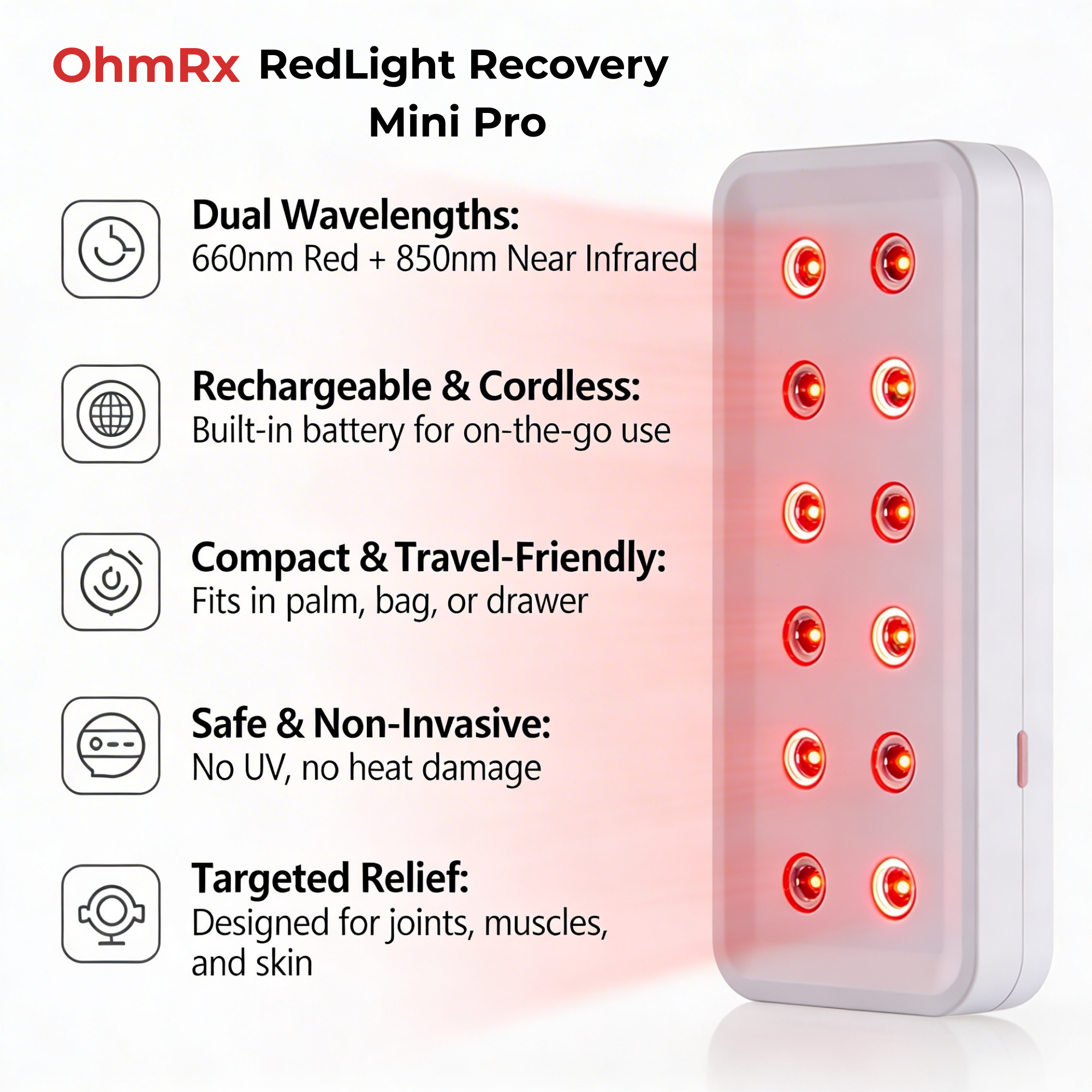 OhmRx RedLight Recovery Mini Pro Device, Portable Red & Infrared LED Light Panel, Rechargeable Handheld Wellness Device